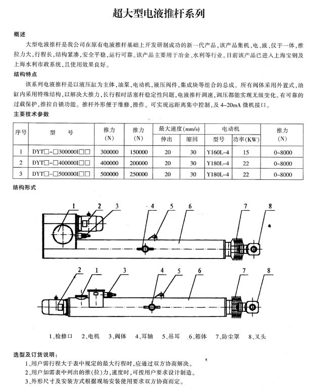 产品名称: 超大型电液推杆 公司名称: 扬州凯斯通液压机械制造厂 产品型号: DYT 产品简介: 电液推杆是一种集机、电、液为一体的液压驱动机械手,适用于需要往复推拉直线(或往复旋转一定角度)运动,也可用于需要上升、下降或夹紧工作物的场所,并可实现远距离危险地区的集中或自动控制。已广泛应用于冶金、矿山、电力、煤炭、机械、交通、粮食、化工、水泥、水利、建材、运输等部门,是一种通用的动力源。