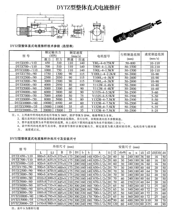 整体直式电液推杆选型参数表: