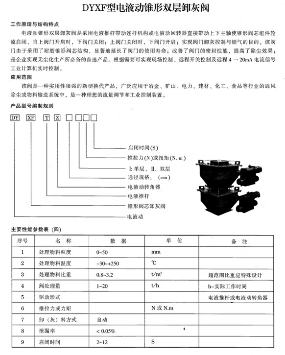 产品名称: 电液动锥形双层卸灰阀 公司名称: 扬州凯斯通液压机械制造厂 产品型号: DYXF 产品简介: DYXF电液动锥形双层卸灰阀是以电液回转器为动力装置,安装在粉尘通道下料部位,是一种理想的流量调节除尘控制装置.现已广泛应用于冶金、矿山、煤炭、电力、水泥、化工等行业,是实现企业无尘化生产所必备的首选产品。