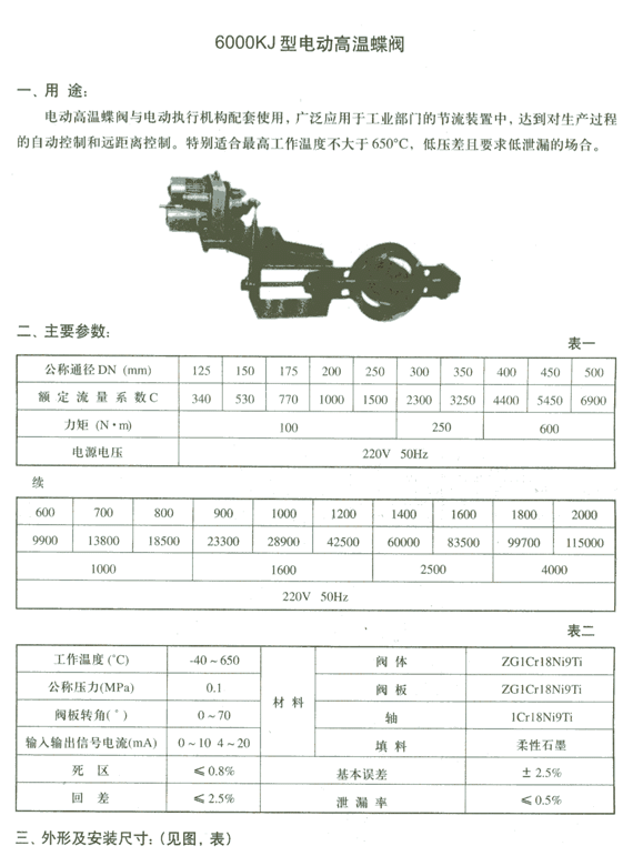 产品名称: 6000KJ型电动高温蝶阀 公司名称: 扬州凯斯通液压机械制造厂 产品型号: 6000KJ型电动高蝶阀 产品简介: 电动高温蝶阀与电动执行器配套使用,广泛应用于工业部门节流装置中,达到对生产过程中的自动控制和计算机远程控制,特适用于最高工作温度不大于650℃,低压差且要求低泄漏的生产场合。