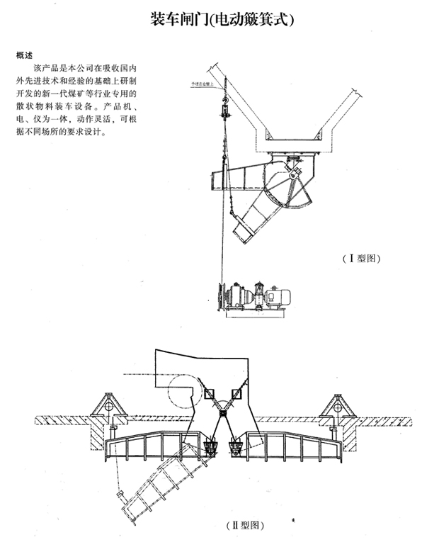 产品名称: 装车闸门 公司名称: 扬州凯斯通液压机械制造厂 产品型号: ZC 产品简介: 装车闸门(电动簸箕式)是本公司在吸收国内外先进技术和经验的基础上研制开发的新一代煤矿等行业专用的散状物料装车设备。该产品机、电、仪为一体,动作灵活,可根据不同场所的要求设计。