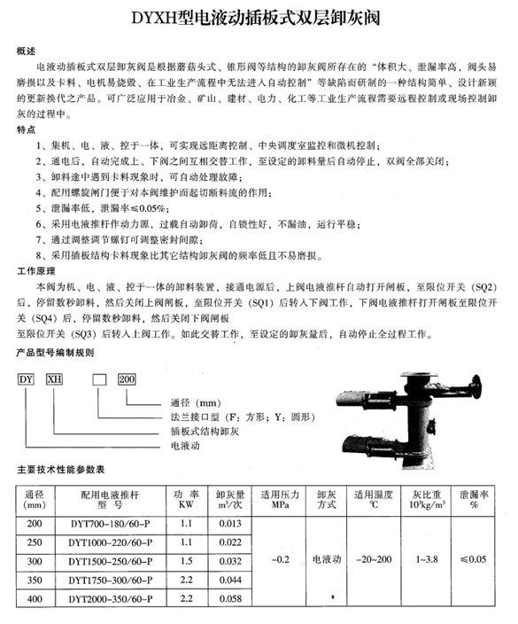 产品名称: 电液动插板式双层卸灰阀 公司名称: 扬州凯斯通液压机械制造厂 产品型号: DYXH 产品简介: 电液动插板式双层卸灰阀该卸灰阀采用电液推杆作动力源,对夹式灰渣(浆)阀作阀门,其阀体板动作灵敏,运行平稳,行程控制准确,有效的缓解冲击力,具有可靠过载保护,广泛应用于冶金、钢铁、水泥、化工、煤矿等行业。