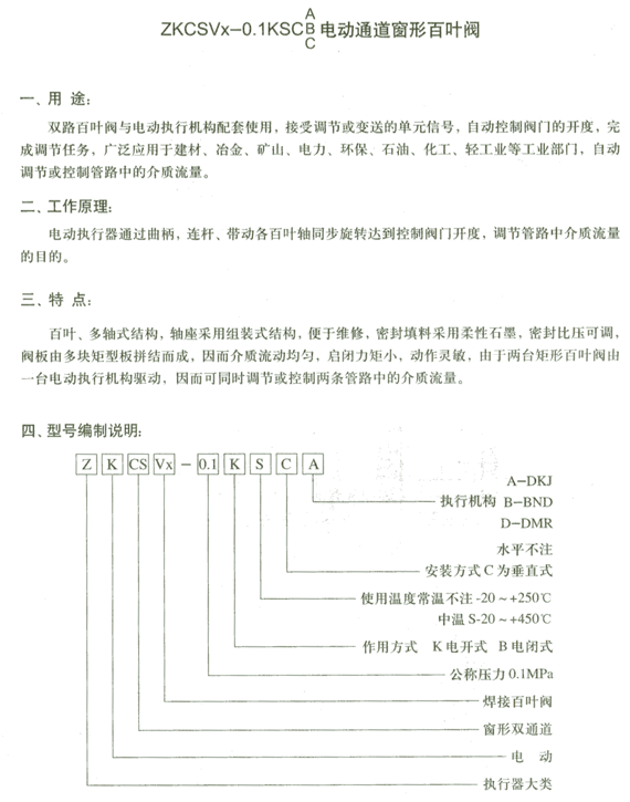 产品名称: 电动通道窗形百叶阀 公司名称: 扬州凯斯通液压机械制造厂 产品型号: ZKSCVx-0.1KSC 产品简介: 双路百叶阀和电动执行器配套使用,接受调节和变送的单元信号,自动控制阀门的开度,完成调节任务,广泛应用于建材、矿山、冶金、电力、环保、石油、化工、轻工业等工业部门,自动调节管路中的介质流量。